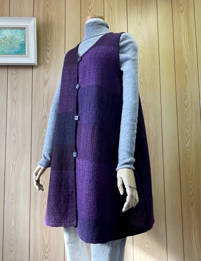 パープルが引き立つロングベストは縦糸、横糸とも細い糸の2本取りで織り上げました。軽く暖かく、長さもあります。コートなどの下に着てもアームホールが気にならない!春先まで着ることができる一枚です。