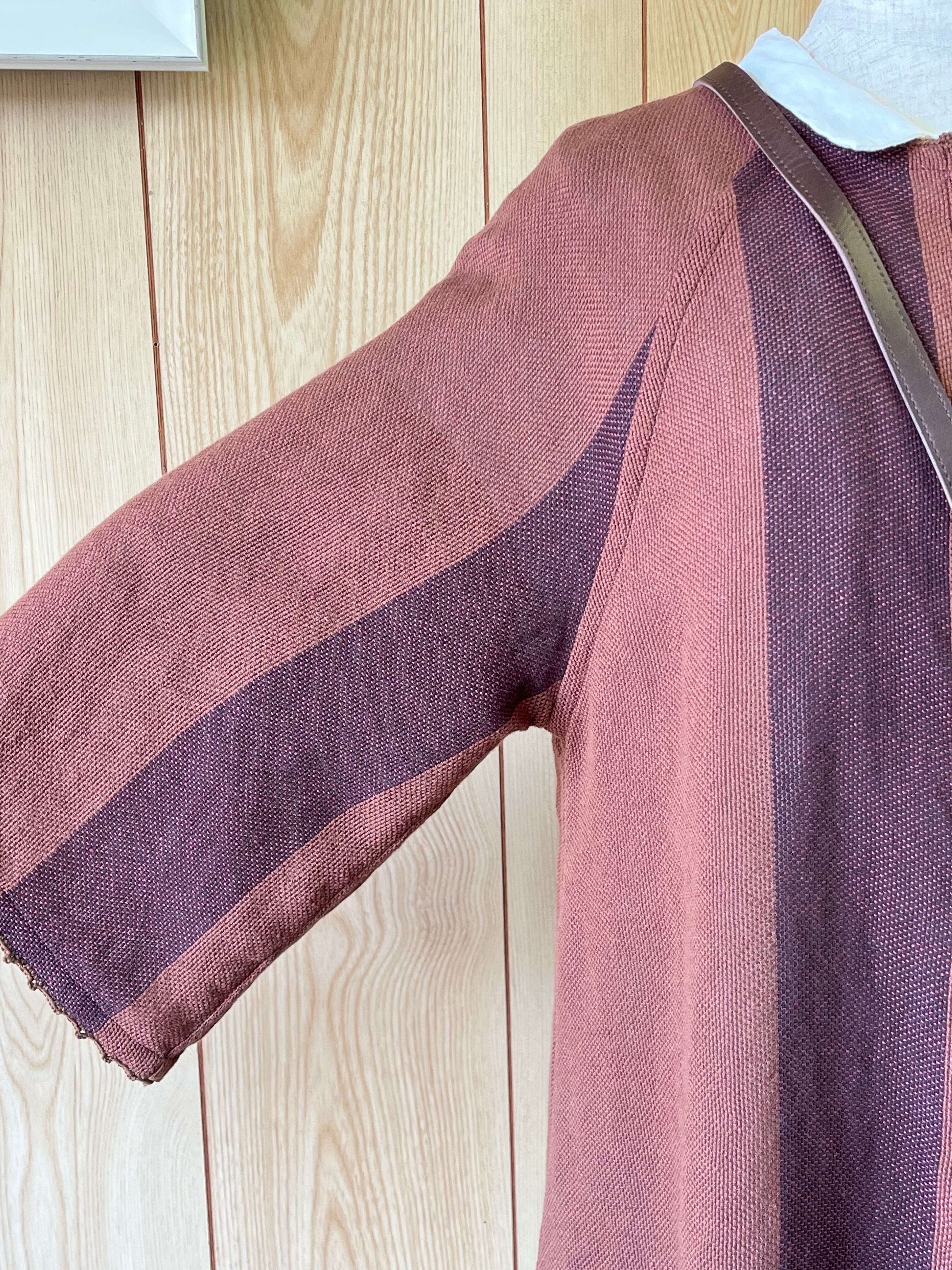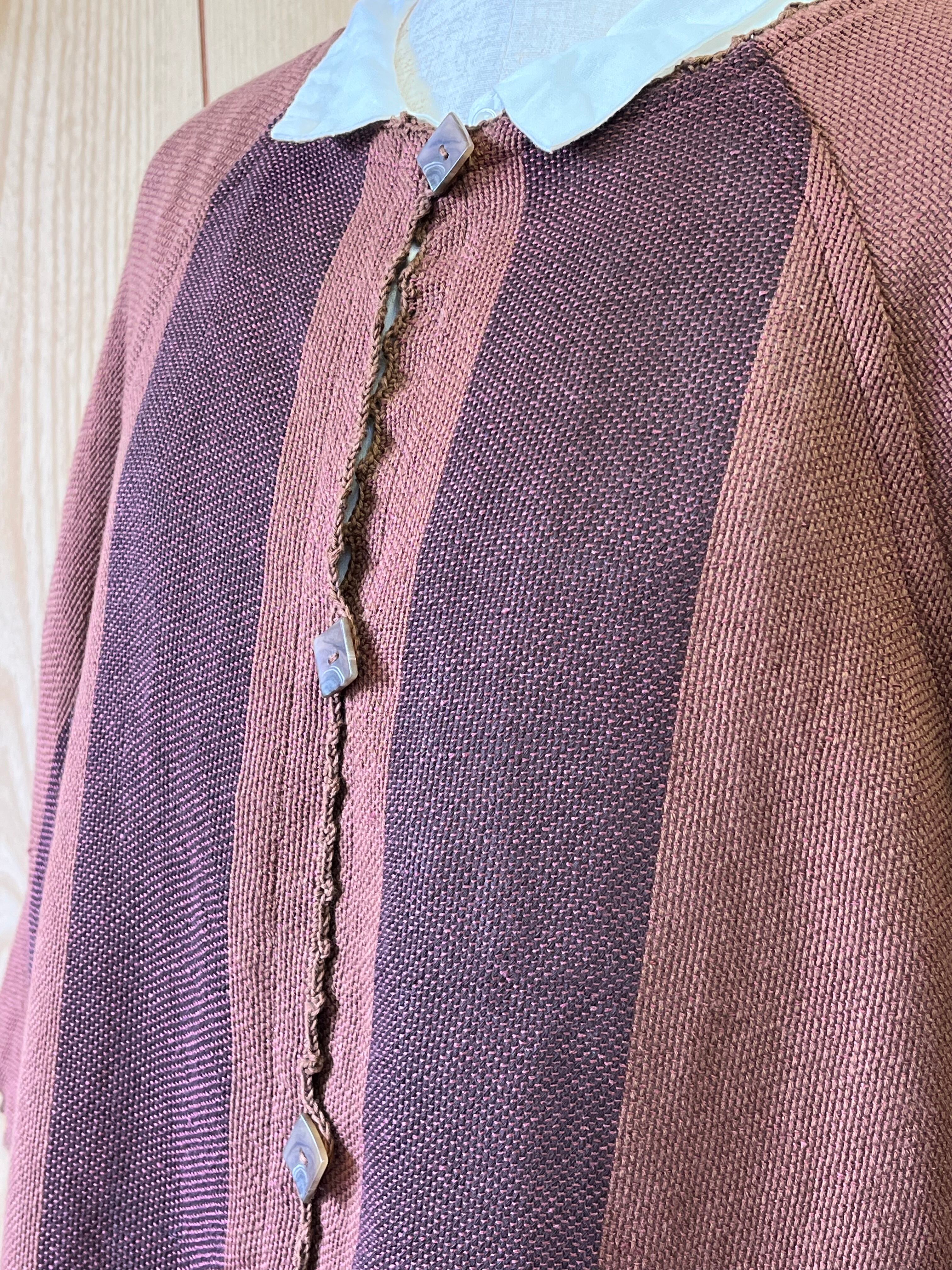 茶色とこげ茶色のストライプ横糸は光沢のある麻のピンク色です。光の当たり方であるピンクがうきでます。袖は七分たけで、袖幅が広めさらっと羽織れるカーディガンです。