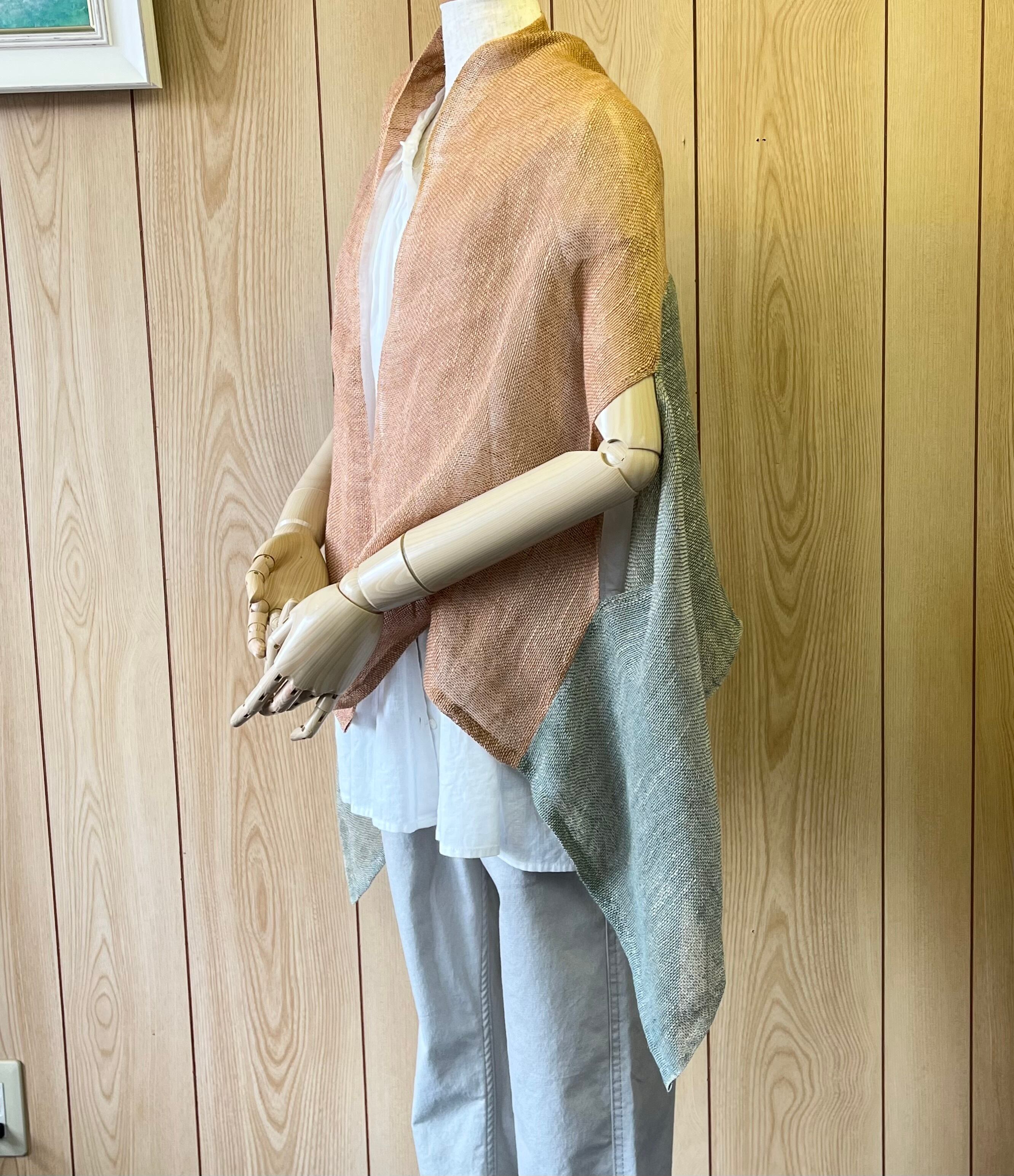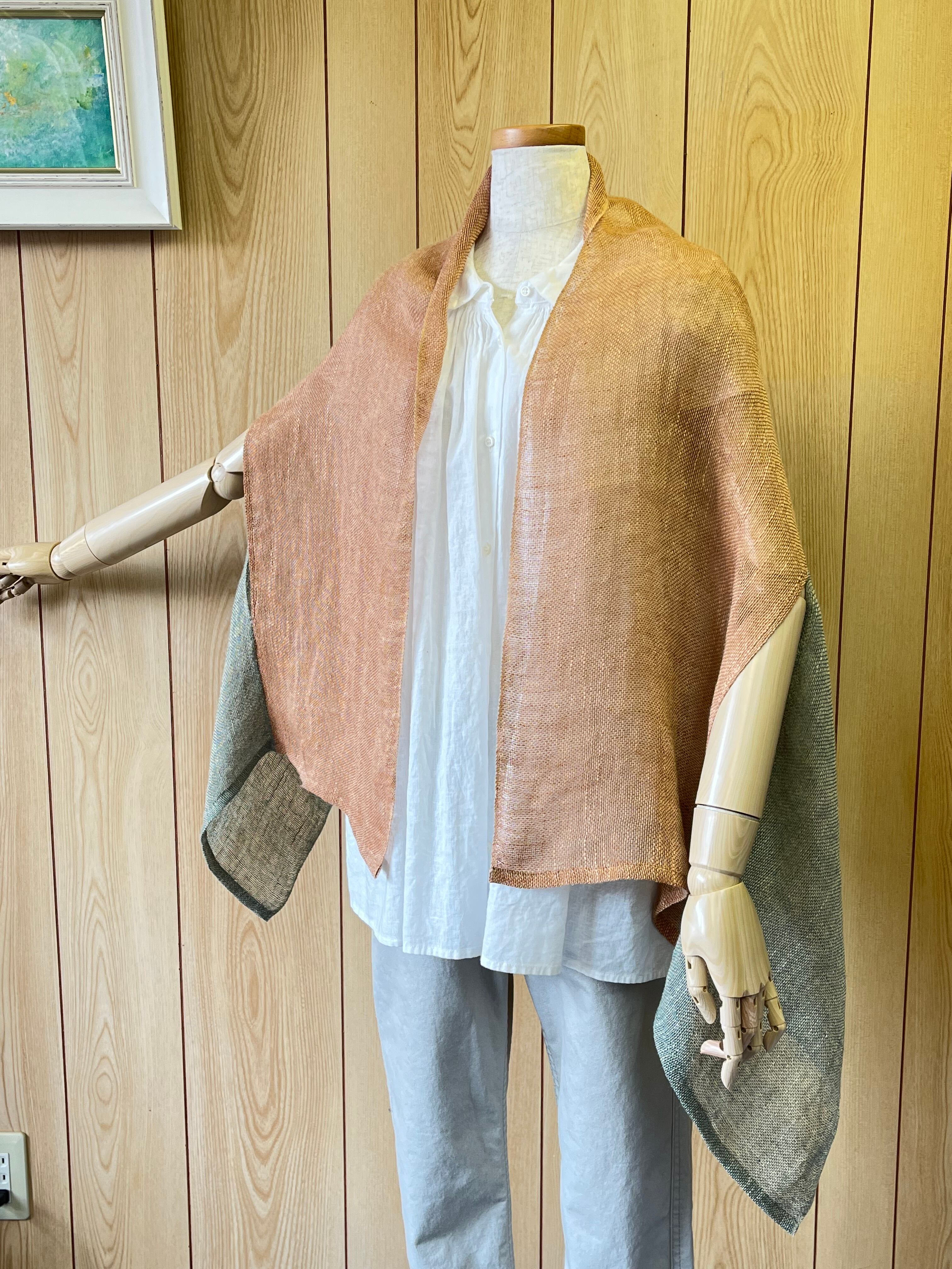 涼しげな大判ストールは麻100%、横糸は光沢のある麻を使用して、光の当たり方である艶がありとても素敵です。腕が出るようになっていますので肩から掛けても落ちにくくカーディガンとも違いとても印象がある一枚です。薄手なので首に巻いてもゴワつきません。