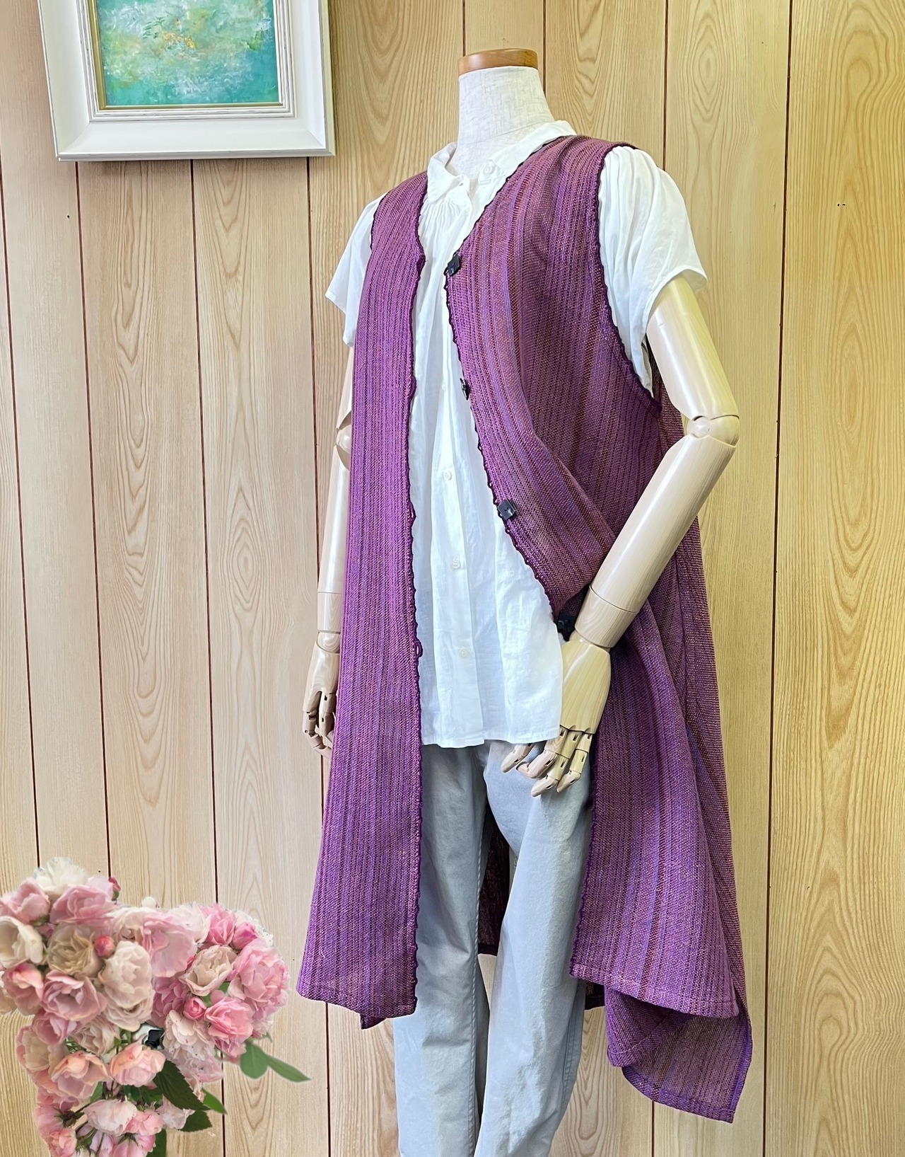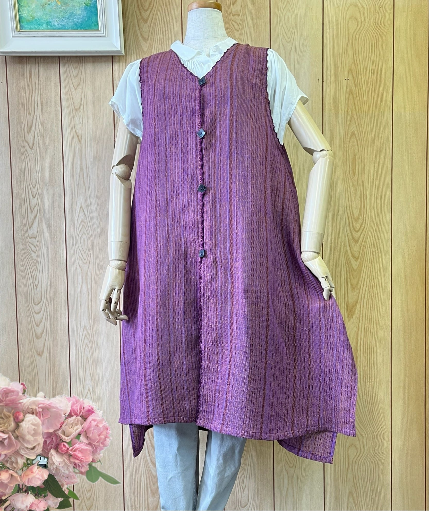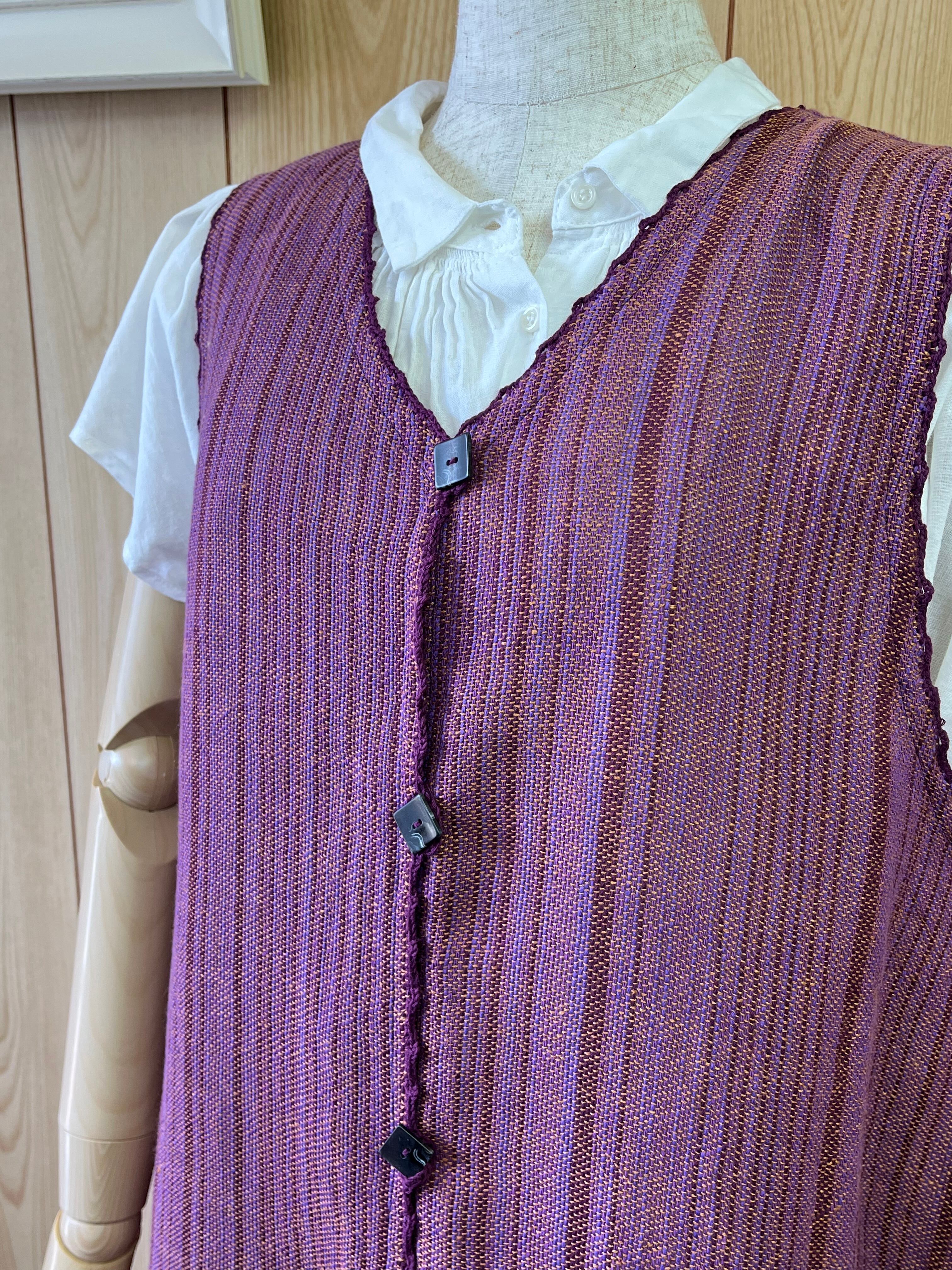 横糸にリネンを使った透け感のあるロングベストです。落ち着いたパープルに光によってオレンジの光沢のあるリネン糸が浮き出てとても素敵な織布です。サラッと羽織れてスカートにもパンツスタイルにも似合います。サイドのスリットがすそに動きを出します♪