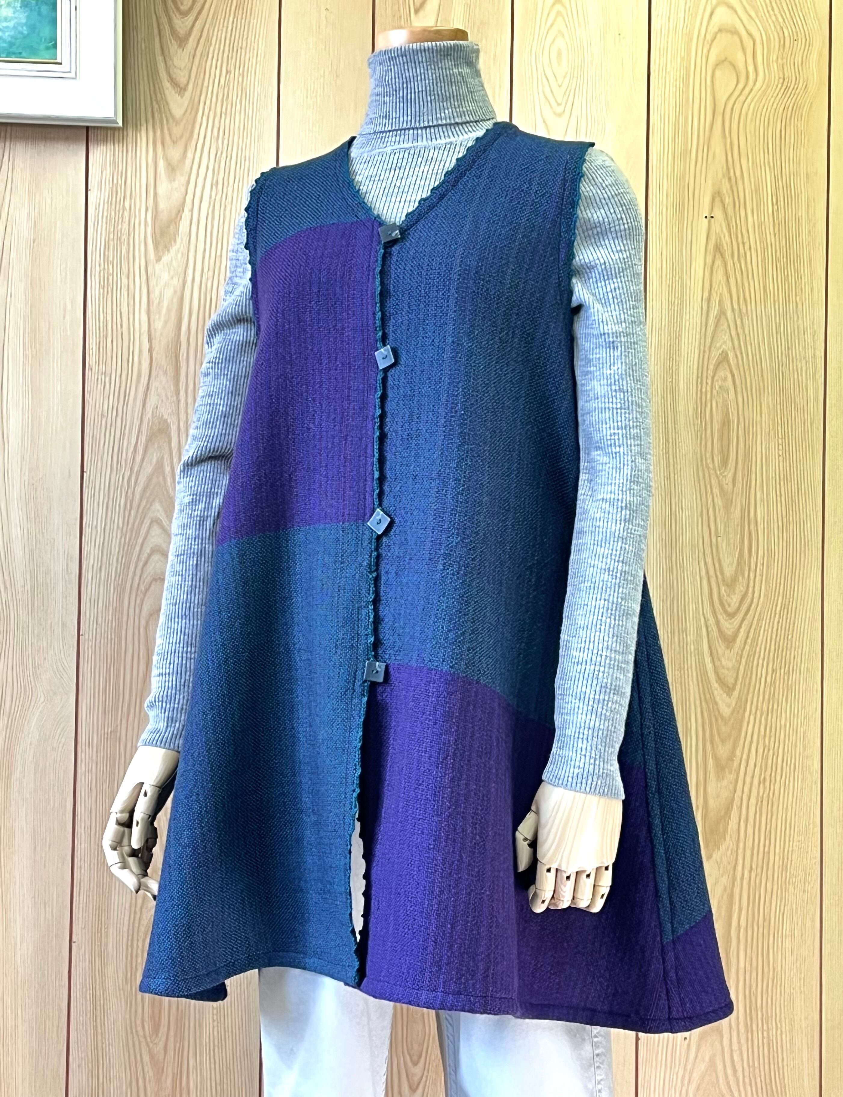 柔らかなウールベストは暖かく軽い仕上がり、合わせやすいブルー系の縦糸を何色を使い、アクセントに横糸に紫を入れました。