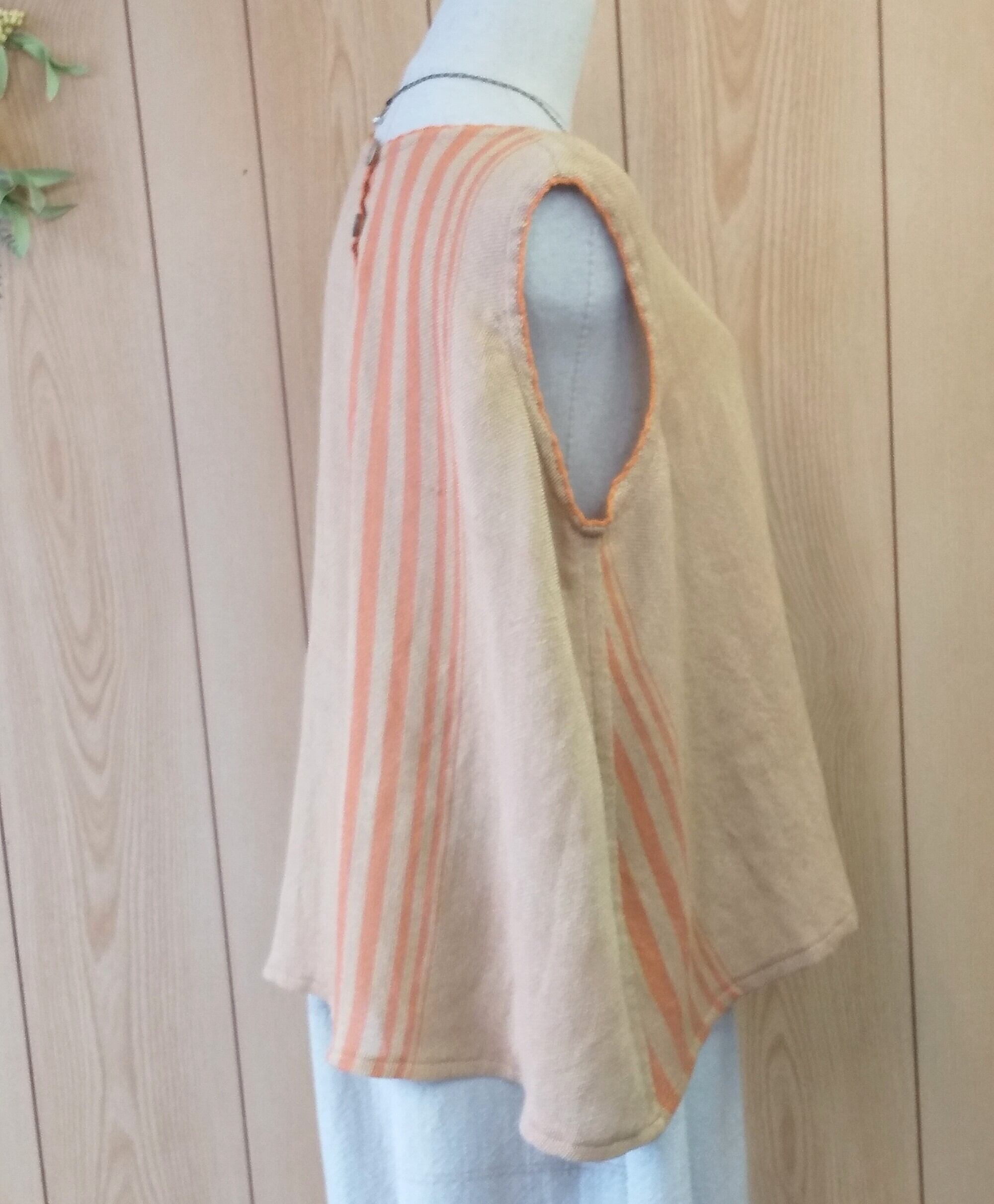 大胆なオレンジのノースリーブは縦糸が綿で横糸は麻糸で透け感のある夏に涼しい素材です。