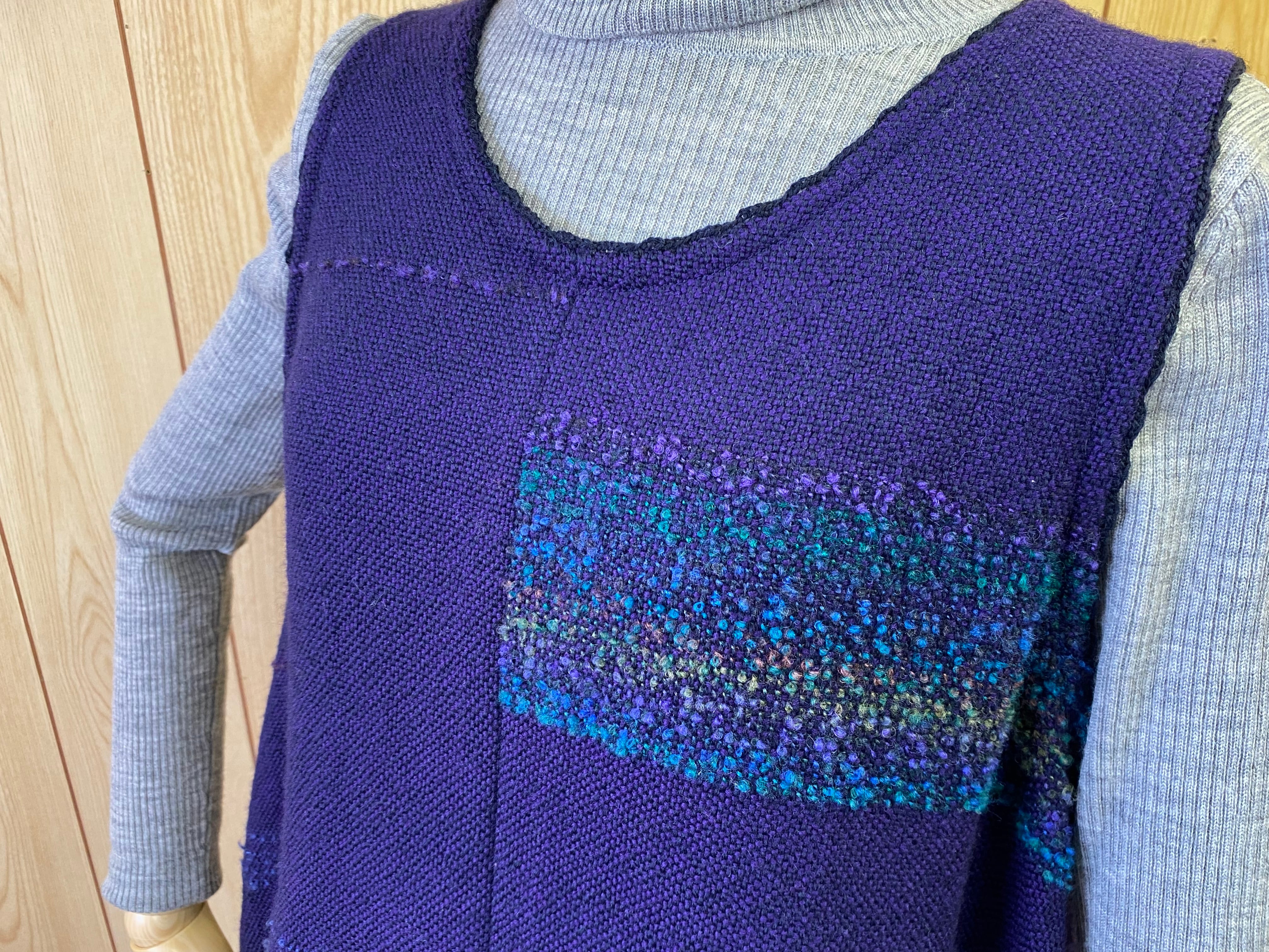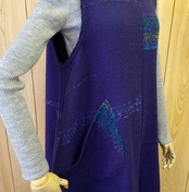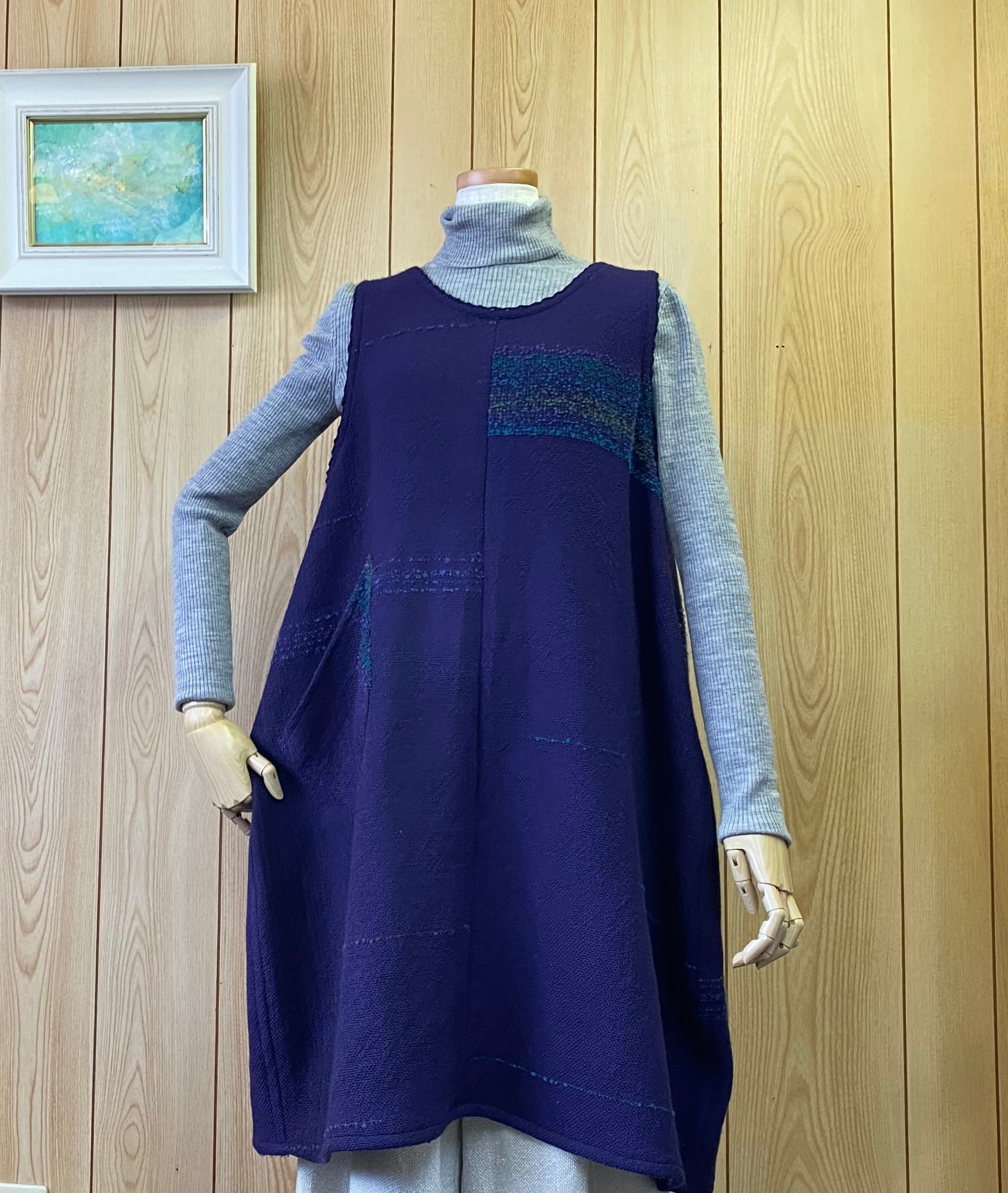 バルーンの型がとてもかわいく、サッと着られてとても便利な一枚です。縦糸に紺色、横糸はパープルを使っていますので光の当たり加減で色が変わります。