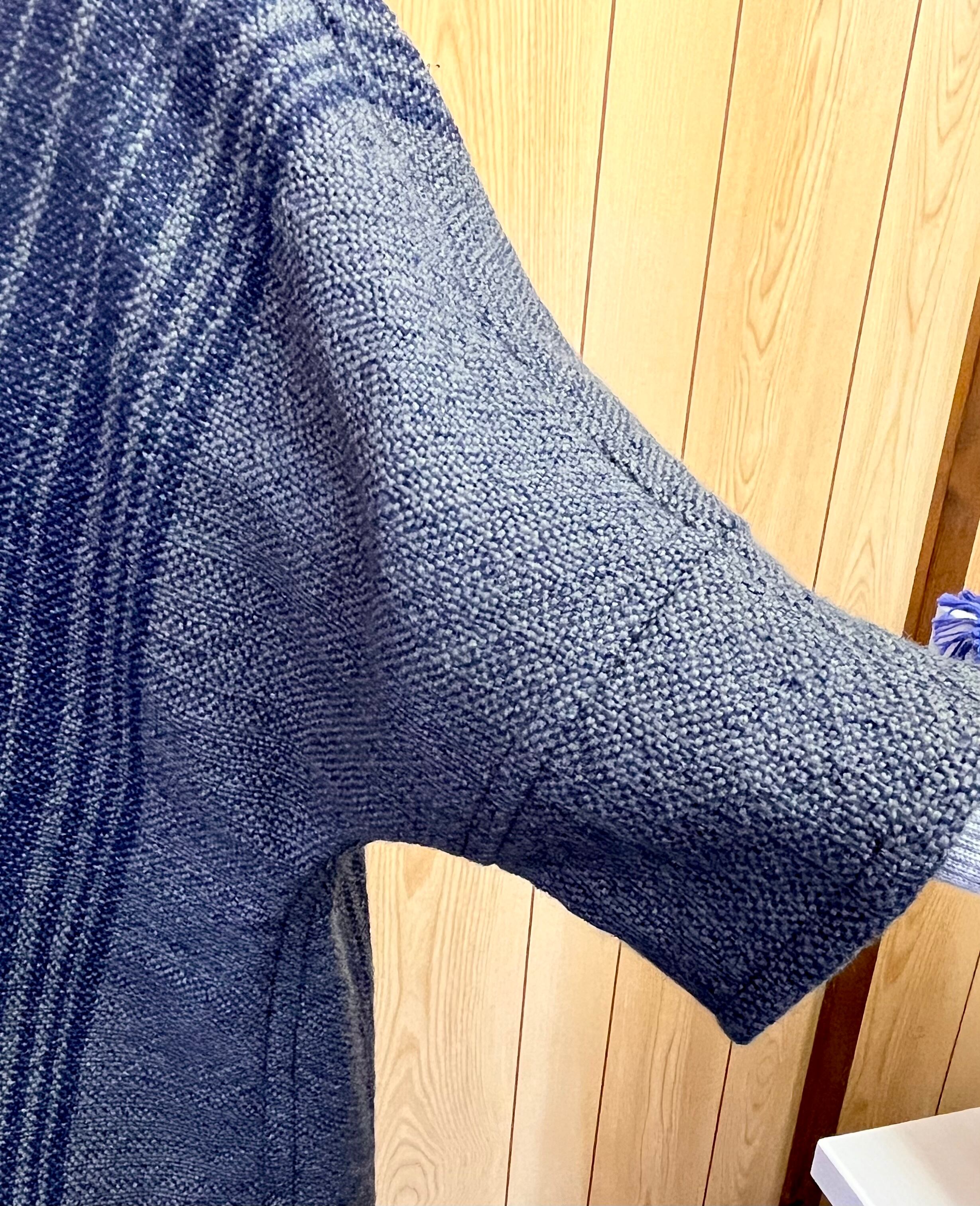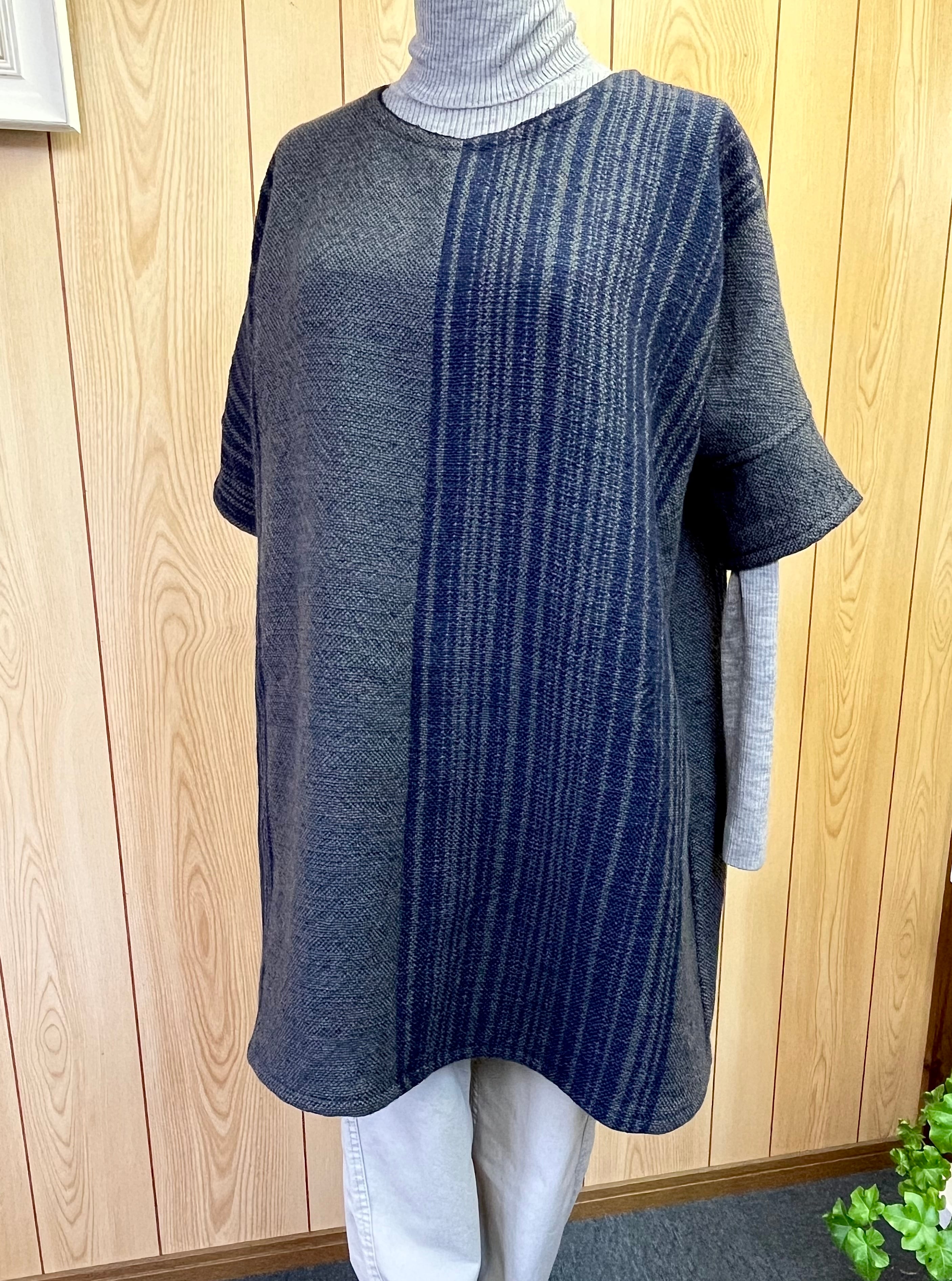 メリノウールでとても柔らかく暖かいチュニックです。縦糸にグレーに紺のストライプ、横糸は細い紺とグレーの引き揃えで織りました。身幅もゆったりとしていて合わせやすいシルエットです。