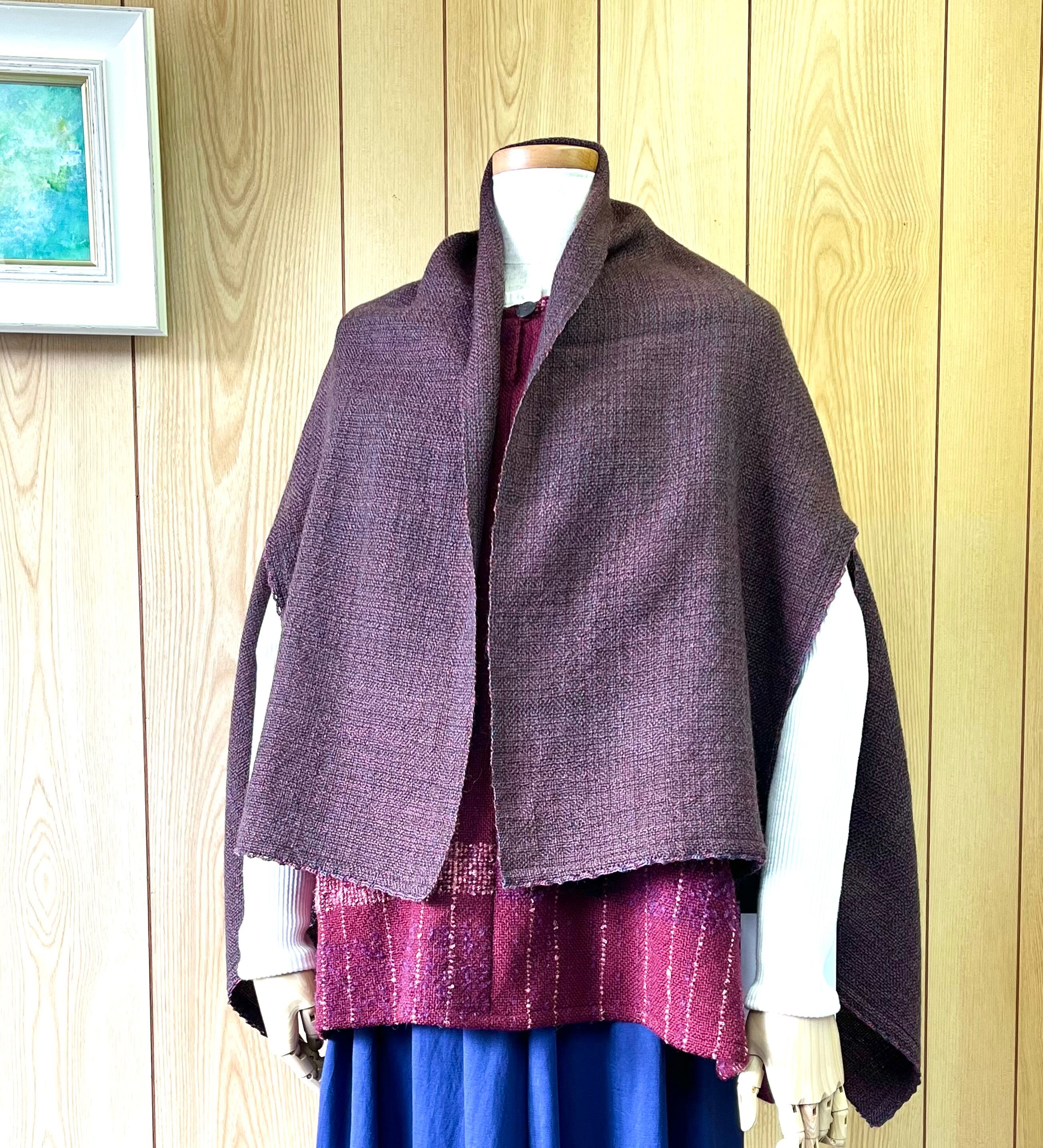 ウールの大判ストールで、腕が出るようになってとても使いやすいストールです。肩からズリ落ちず、まえをブローチなどで止めるとポンチョのように使えます。