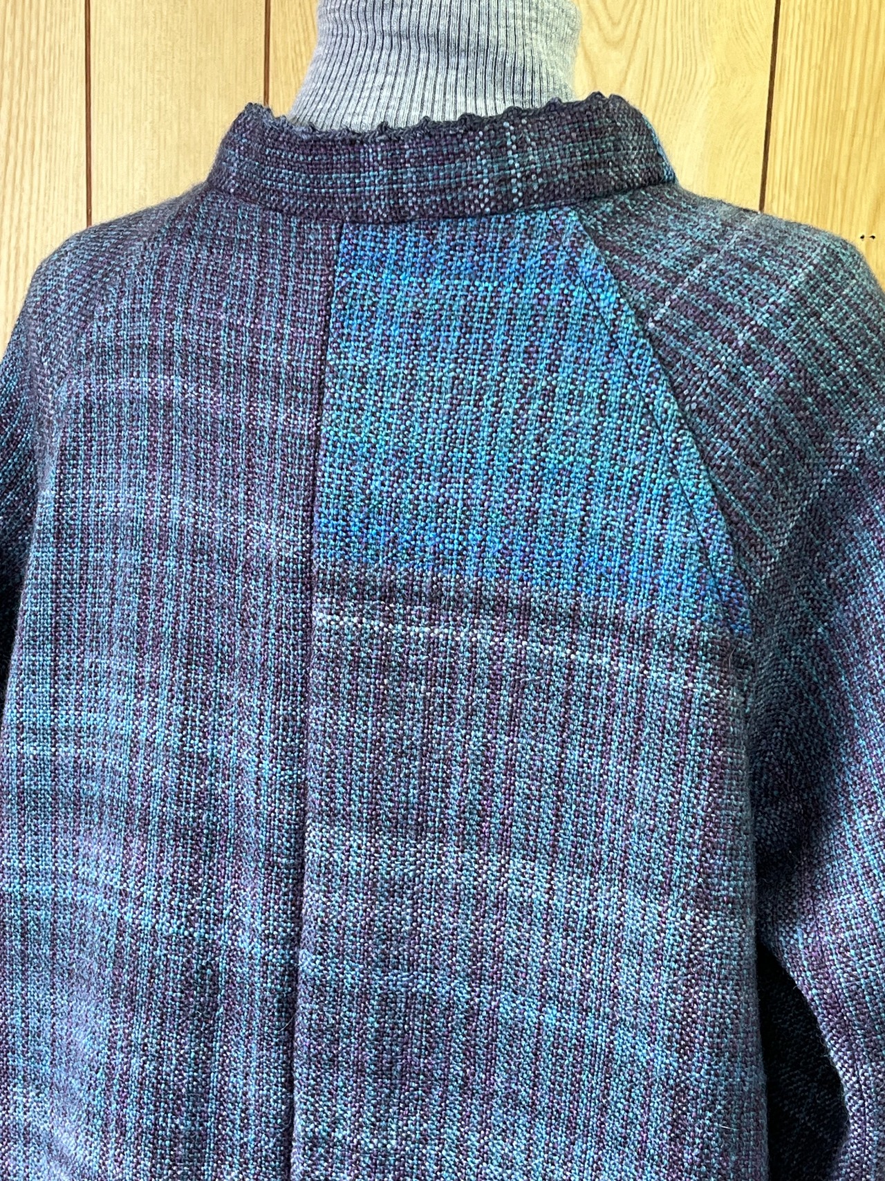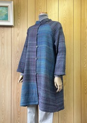 グラデーションの横糸がキレイな織布は青の糸がアクセントで、ゆるめのスタンドカラーがかわいいカーデガンコートです。